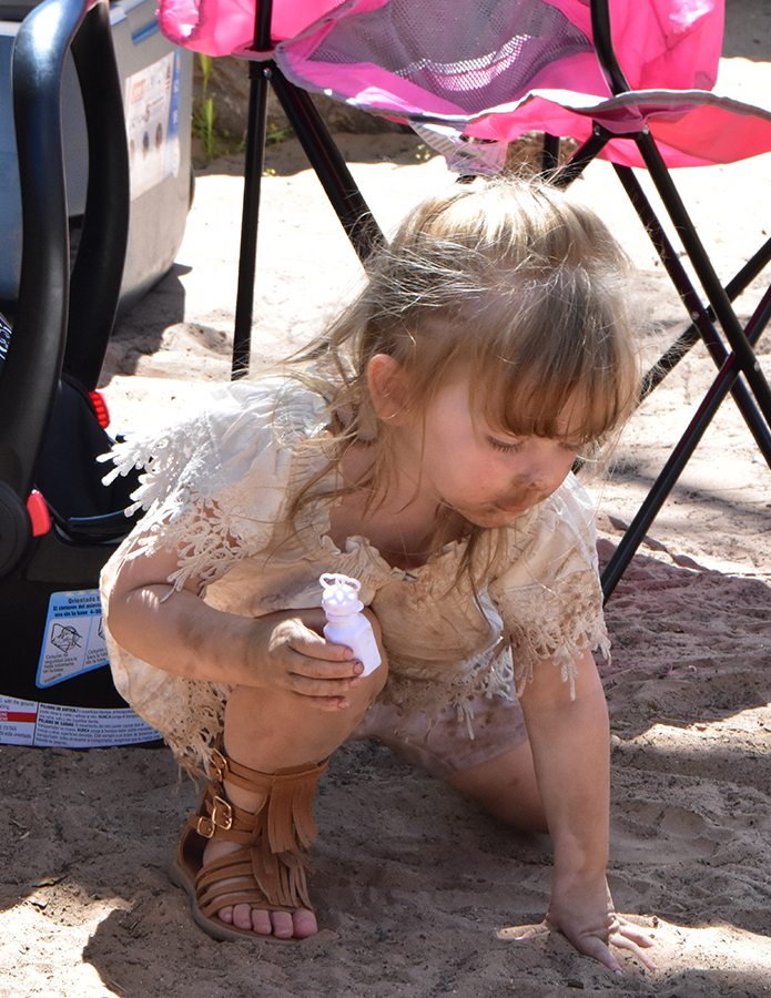 That dress will never be close to white again. She was crawling belly-down in the sand.