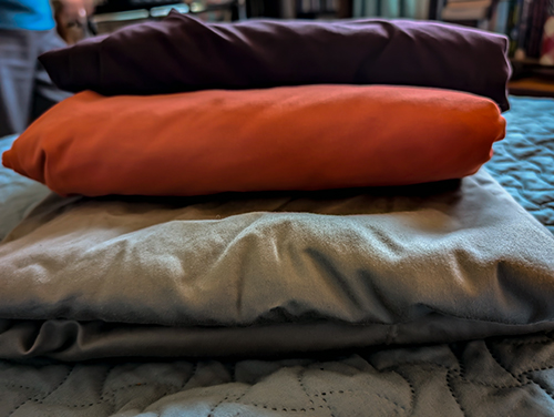 I also hit thrift stores over the weekend and bought some sheets, so I can cannibalize the fabric for sewing. The purple and orangey-red ones are microfiber and I think queen size. I most likely can’t use them for my own finished clothing. I could use them for a muslin/test garment if I were so inclined, but my tentative plan is for things for my granddaughter.