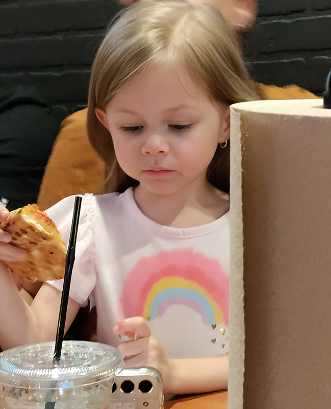 Pictured is my youngest son’s youngest daughter.  She’s a smart (if quiet) little thing, four years old, and she managed – by herself – to down an entire pizza!! I haven’t got a clue where she puts it. Did I mention she is tiny???